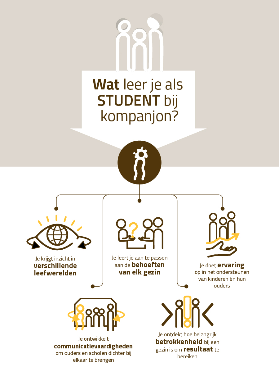 Tijdens een semester als ‘kompanjon’ ervaart een student wat maatschappelijke kwetsbaarheid betekent en hoe complex het is om eerlijke onderwijskansen waar te maken. Zo leert een jonge professional buiten de schoolmuren om te gaan met complexe uitdagingen in de samenleving zoals armoede, ongelijkheid en sociaal-culturele verschillen. Tegelijk krijgt de student de kans om sociaal engagement waar te maken en als het ware een ambassadeur te worden van kwetsbare kinderen en hun gezin.